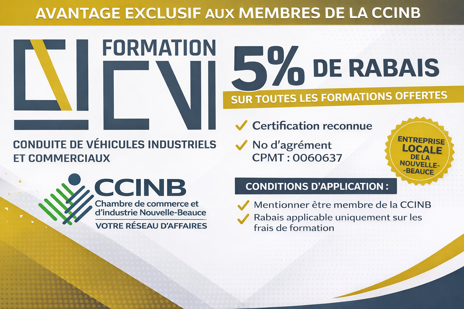 Formation CVI est heureuse d’offrir aux membres de la Chambre de commerce et d’industrie Nouvelle-Beauce un rabais exclusif de 5 % sur l’ensemble de ses formations.